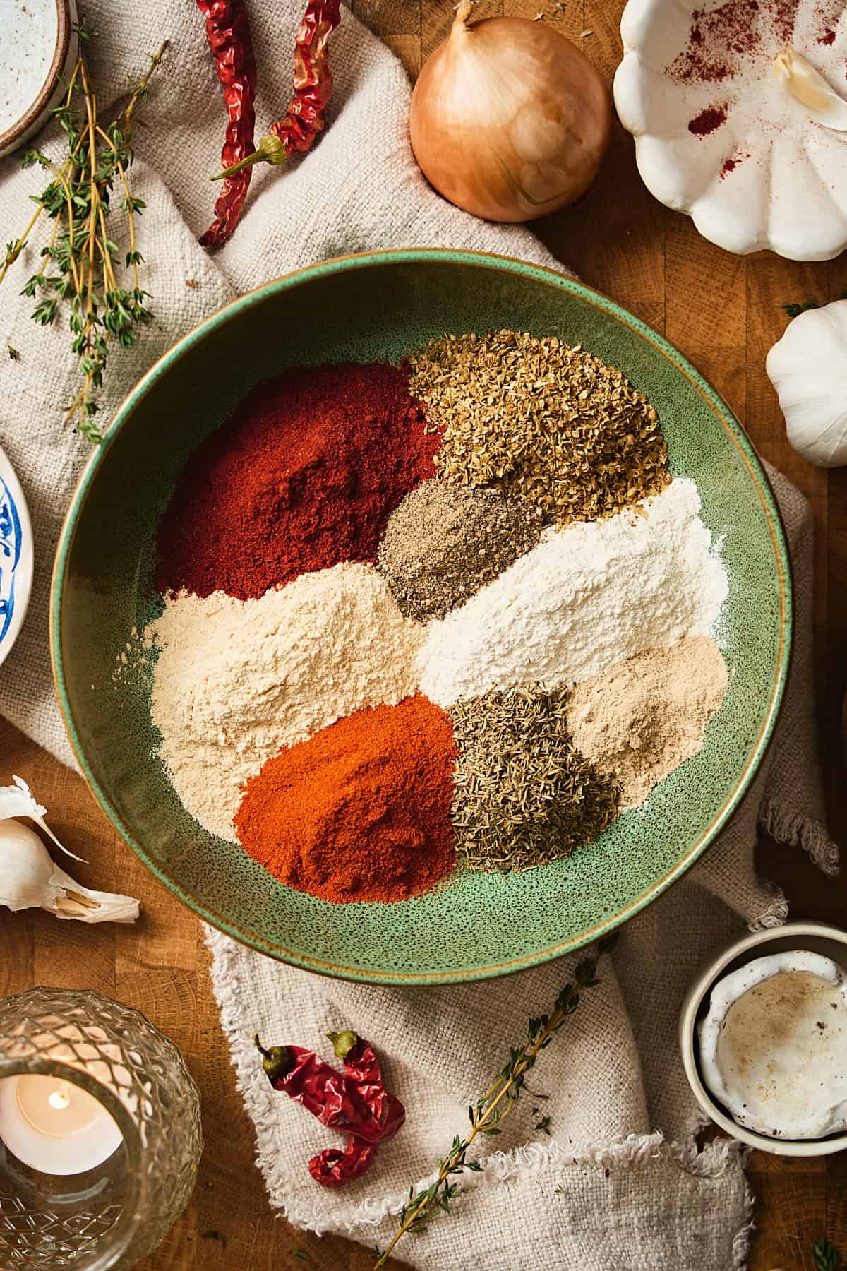 - Combine the spices. Add the smoked paprika, garlic powder, onion powder, dried oregano, dried thyme, cayenne pepper, black pepper, and white pepper to a medium bowl.2 tablespoons smoked paprika, 2 tablespoons garlic powder, 2 tablespoons onion powder, 2 tablespoons dried oregano, 1 tablespoon dried thyme, 1½ tablespoons cayenne pepper, ½ tablespoon black pepper, ½ tablespoon white pepper