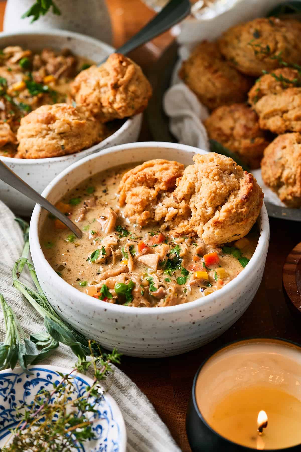 Neither of our families cooked from scratch much, so Chamere and I both grew up on frozen dinners. Pot pies were the special ones - a real treat when Mom brought those home. This is the from-scratch, grown-up version we wish we'd had back then, but in soup form, that gets loaded up with the most perfect herbed drop biscuits. 🤤